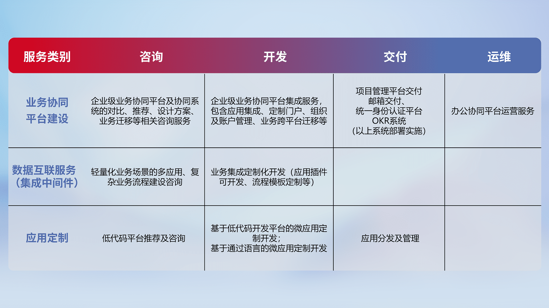针对钉钉、、、企微、、IDaas等平台级产品提供产品的规划、、、方案、、交付、、定制化开发等服务,,实现如统一协同办公、、智能客户服务、、、混合会议管理、、、智能数据查询、、等业务场景,,,实现数字化转型。。。